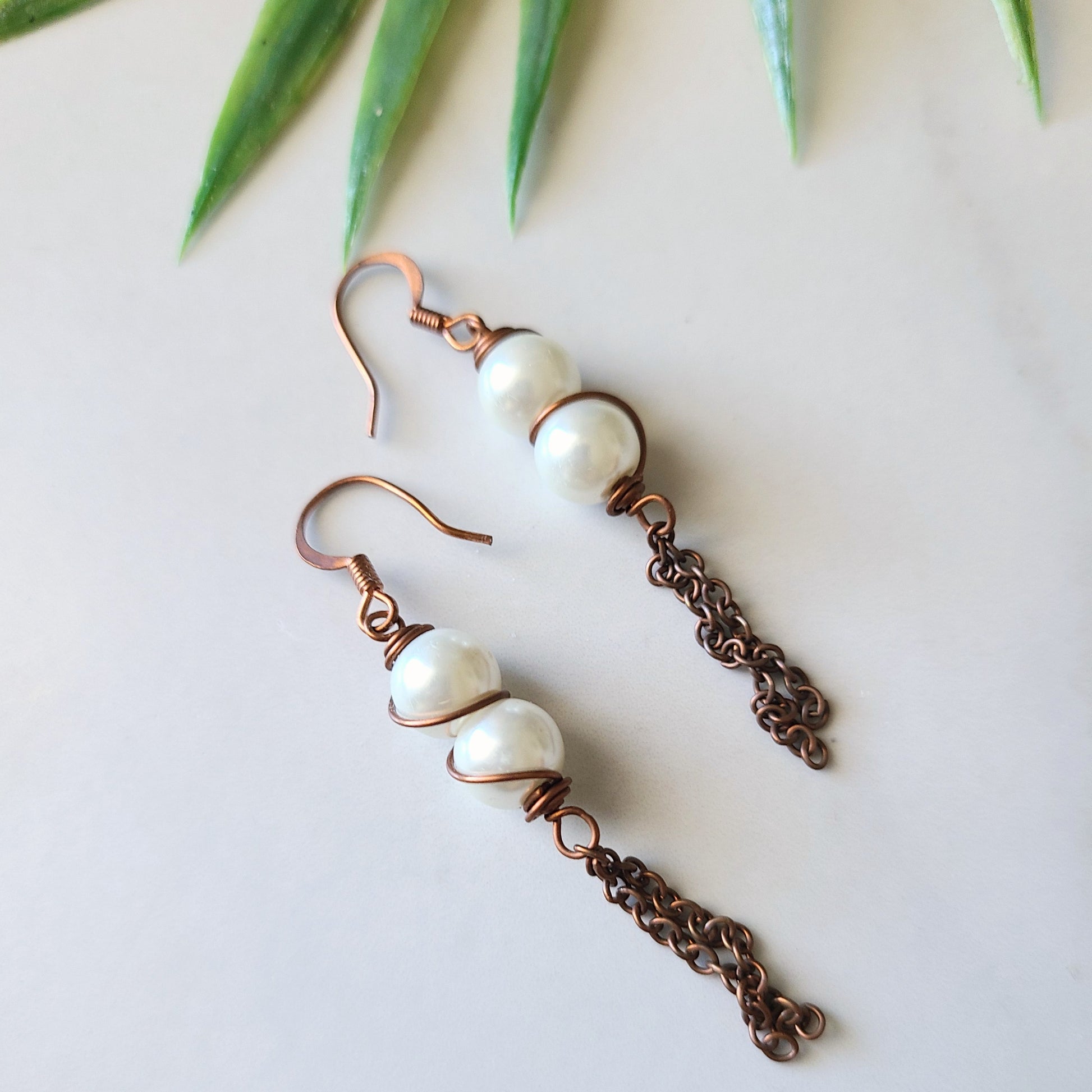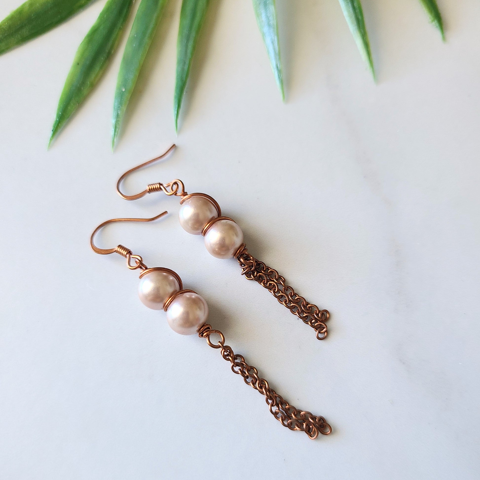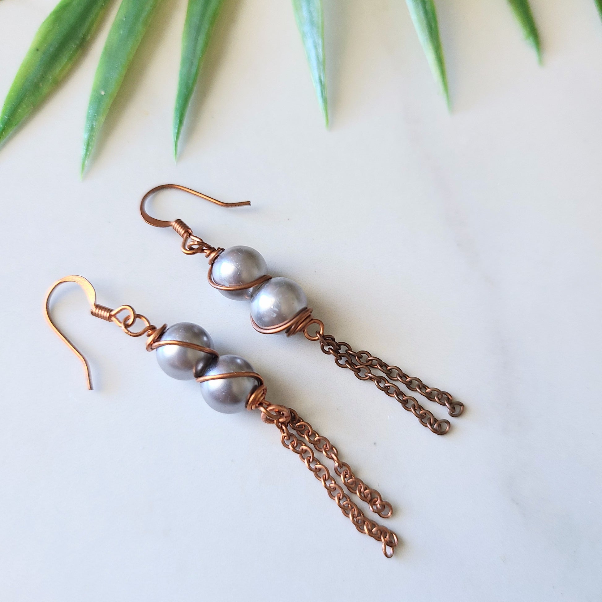 Pearl, gemstone or lava bead duo on solid copper wire with copper earwires and copper chain tassels.