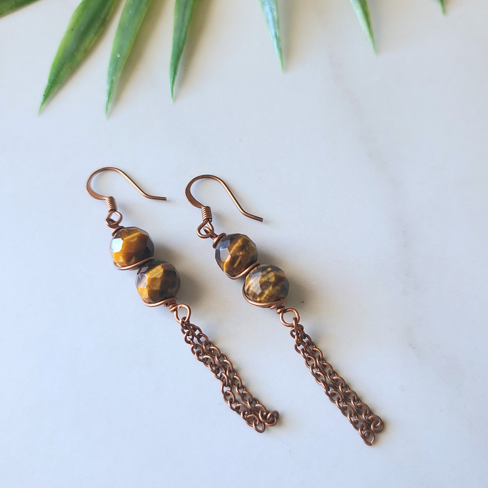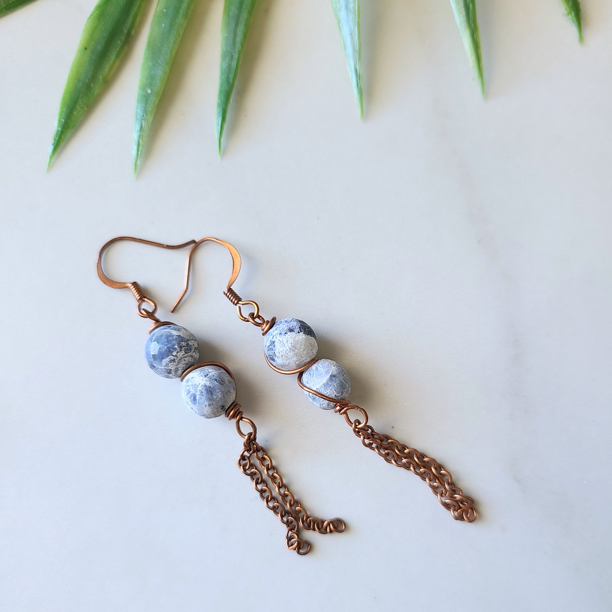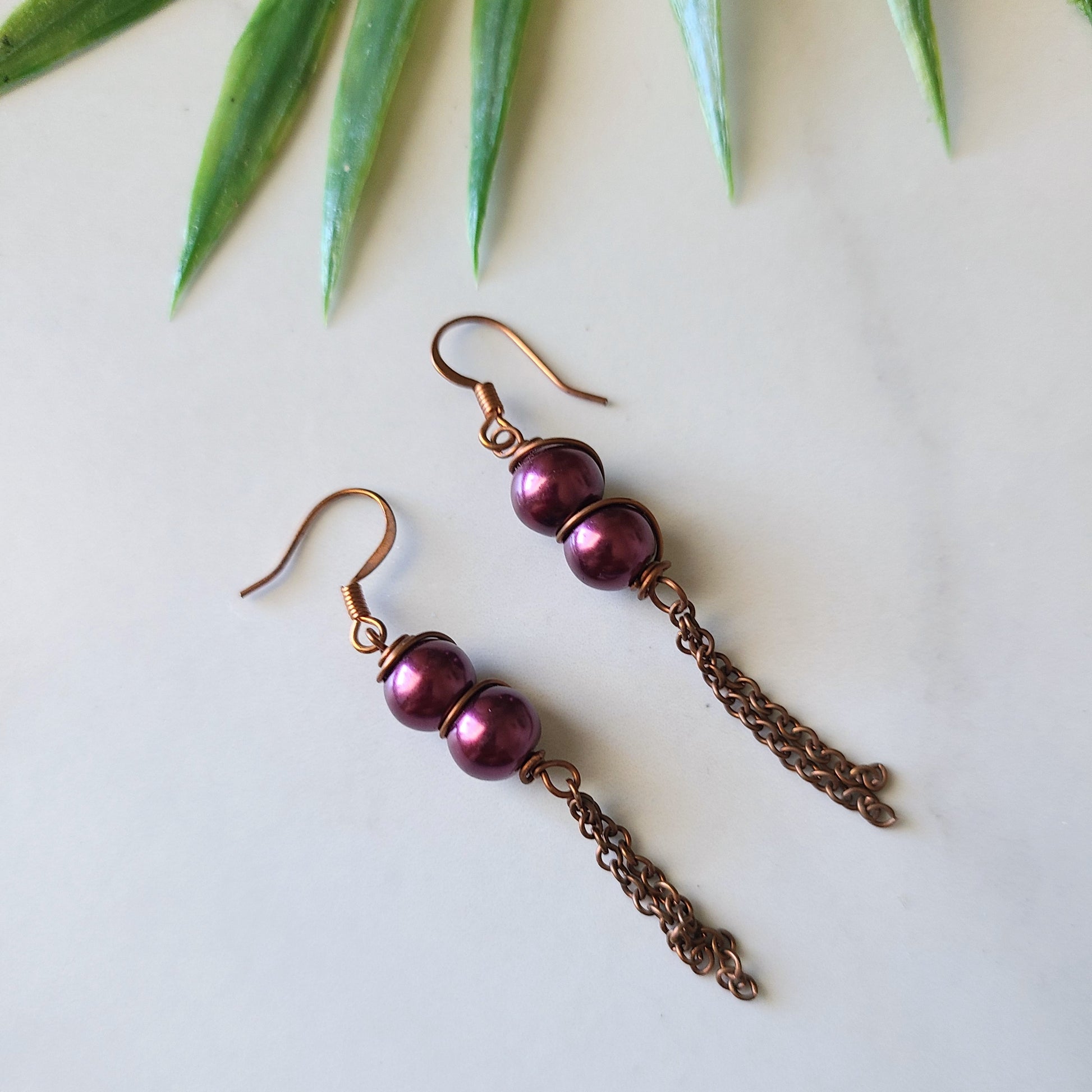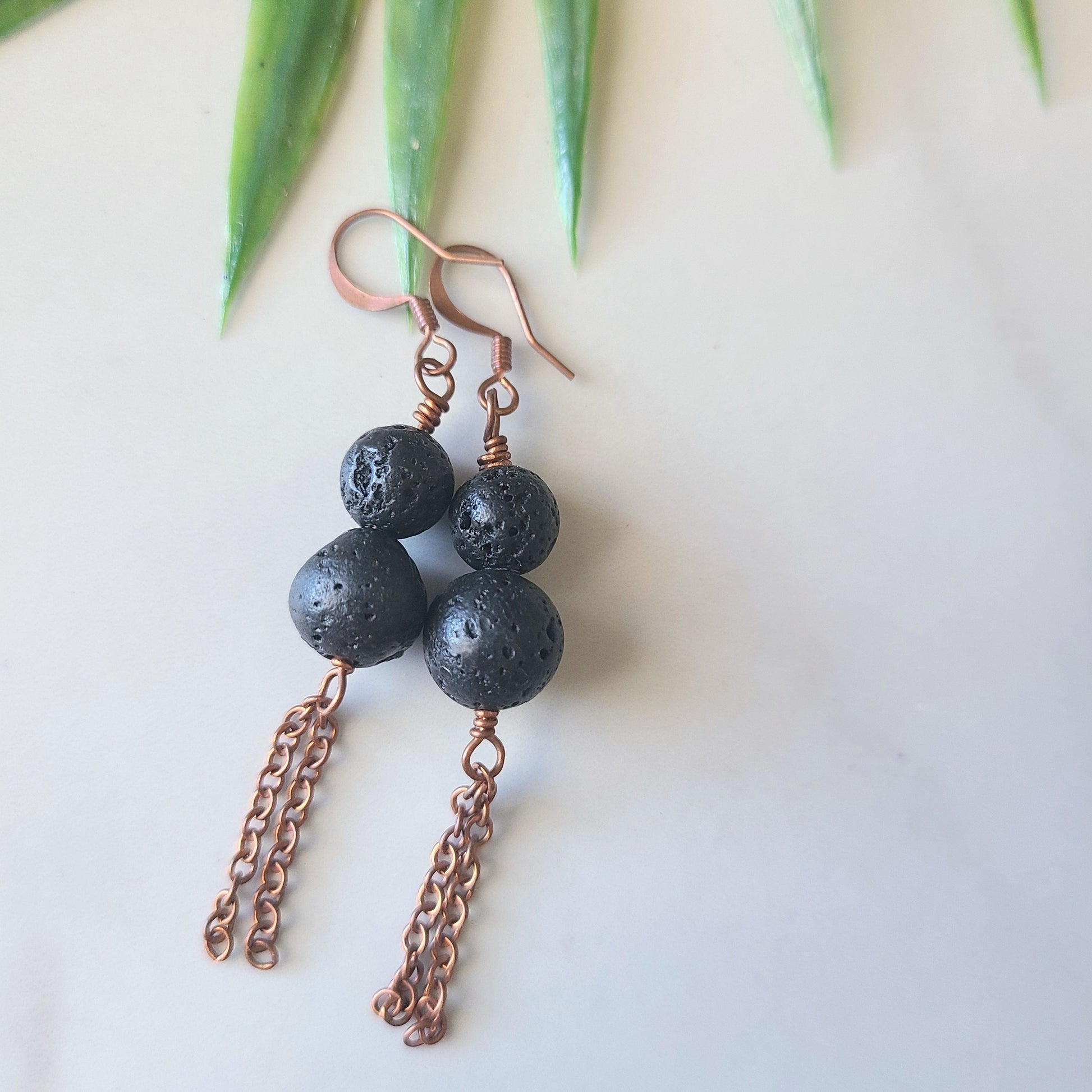 Pearl, gemstone or lava bead duo on solid copper wire with copper earwires and copper chain tassels.