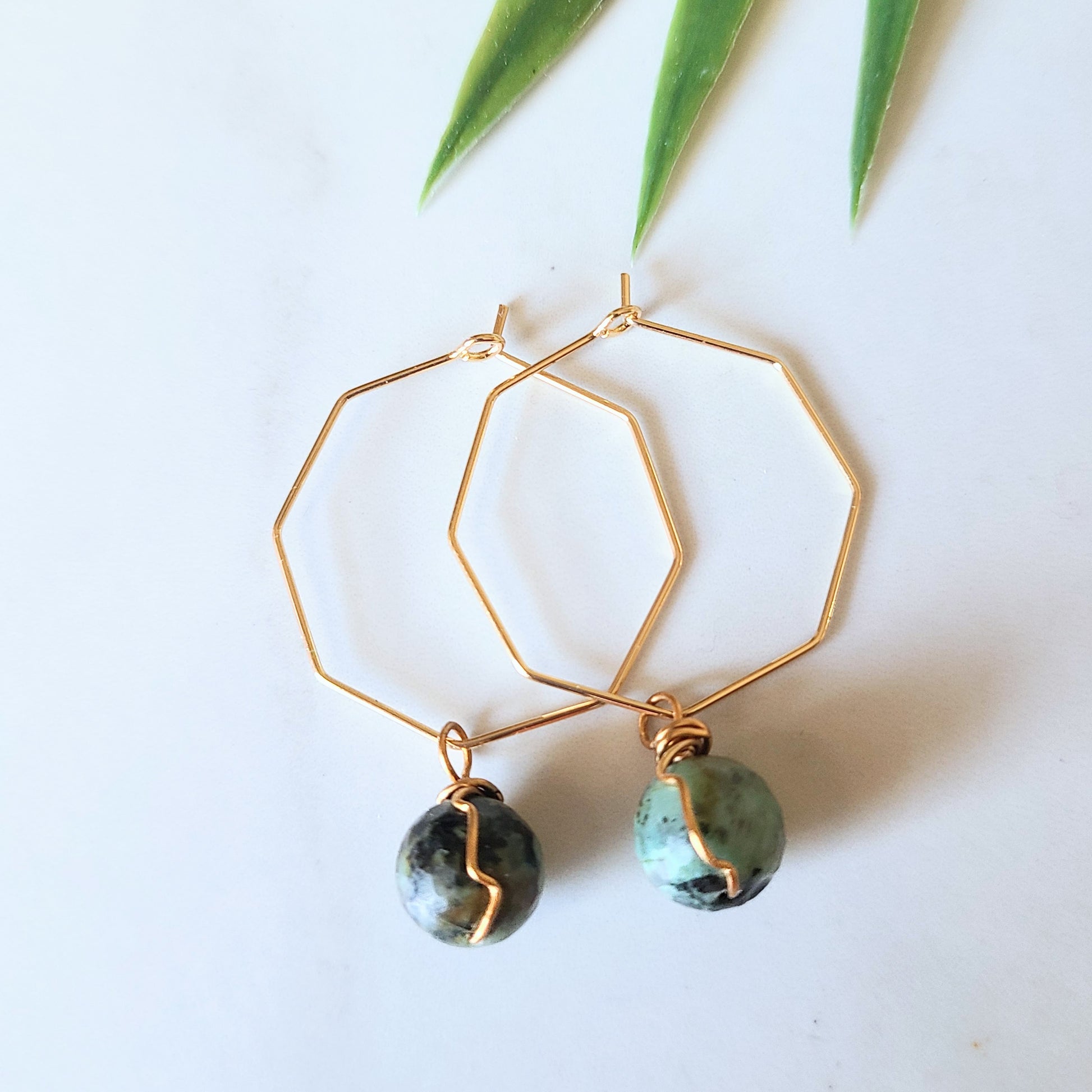 Single hand wrapped natural gemstone sphere swinging on an gold plated octagon hoop.