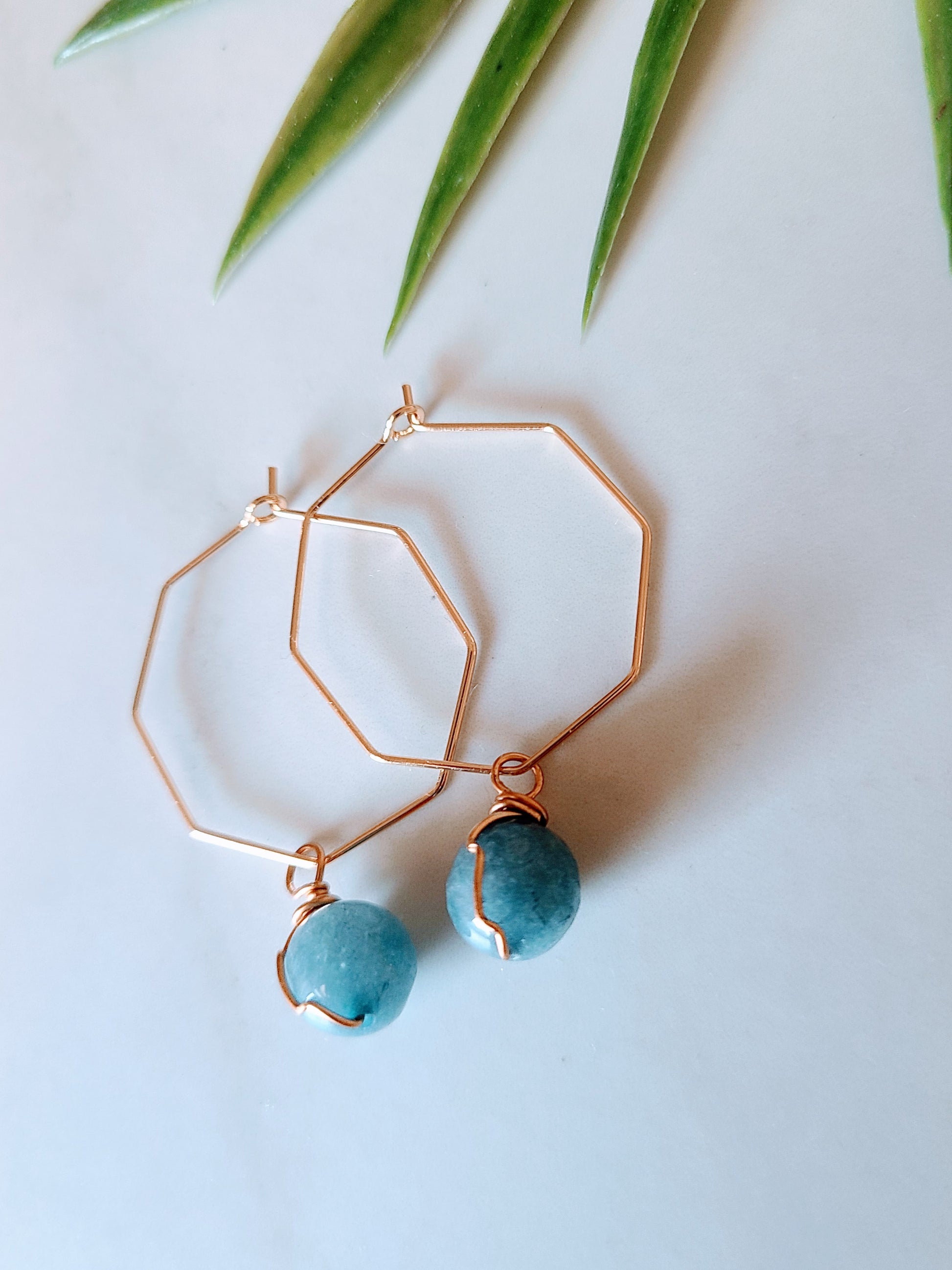 Single hand wrapped natural gemstone sphere swinging on an gold plated octagon hoop.
