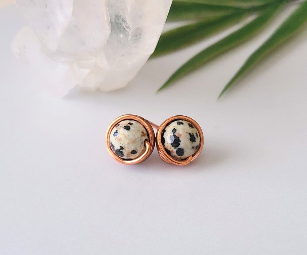 Natural gemstone sphere wrapped in raw copper to make the perfect studs for any and everyone. Pop in a pair to take some good vibes on your journey!