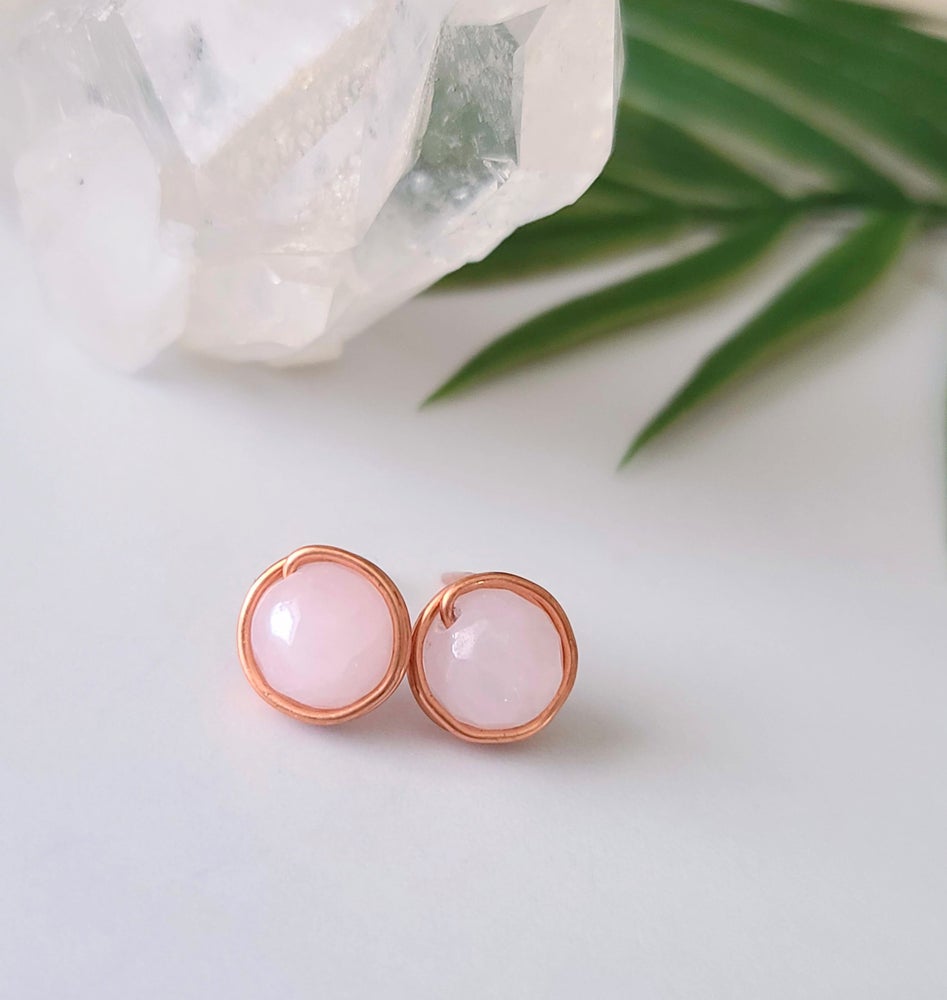 Natural gemstone sphere wrapped in raw copper to make the perfect studs for any and everyone. Pop in a pair to take some good vibes on your journey!