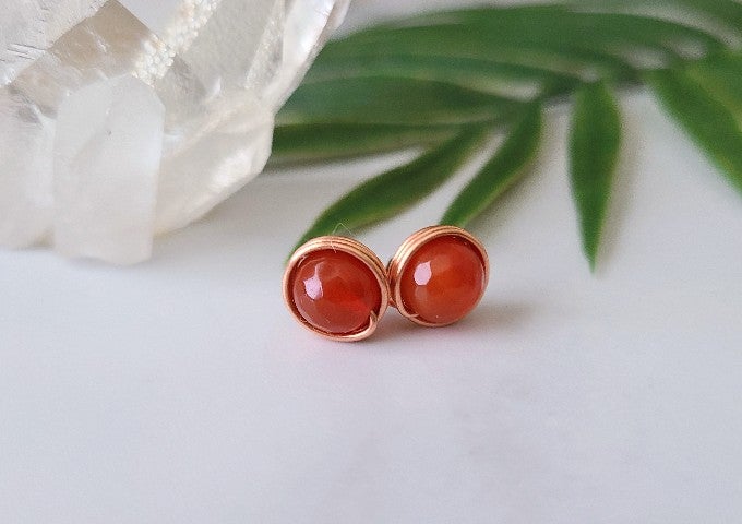 Natural gemstone sphere wrapped in raw copper to make the perfect studs for any and everyone. Pop in a pair to take some good vibes on your journey!