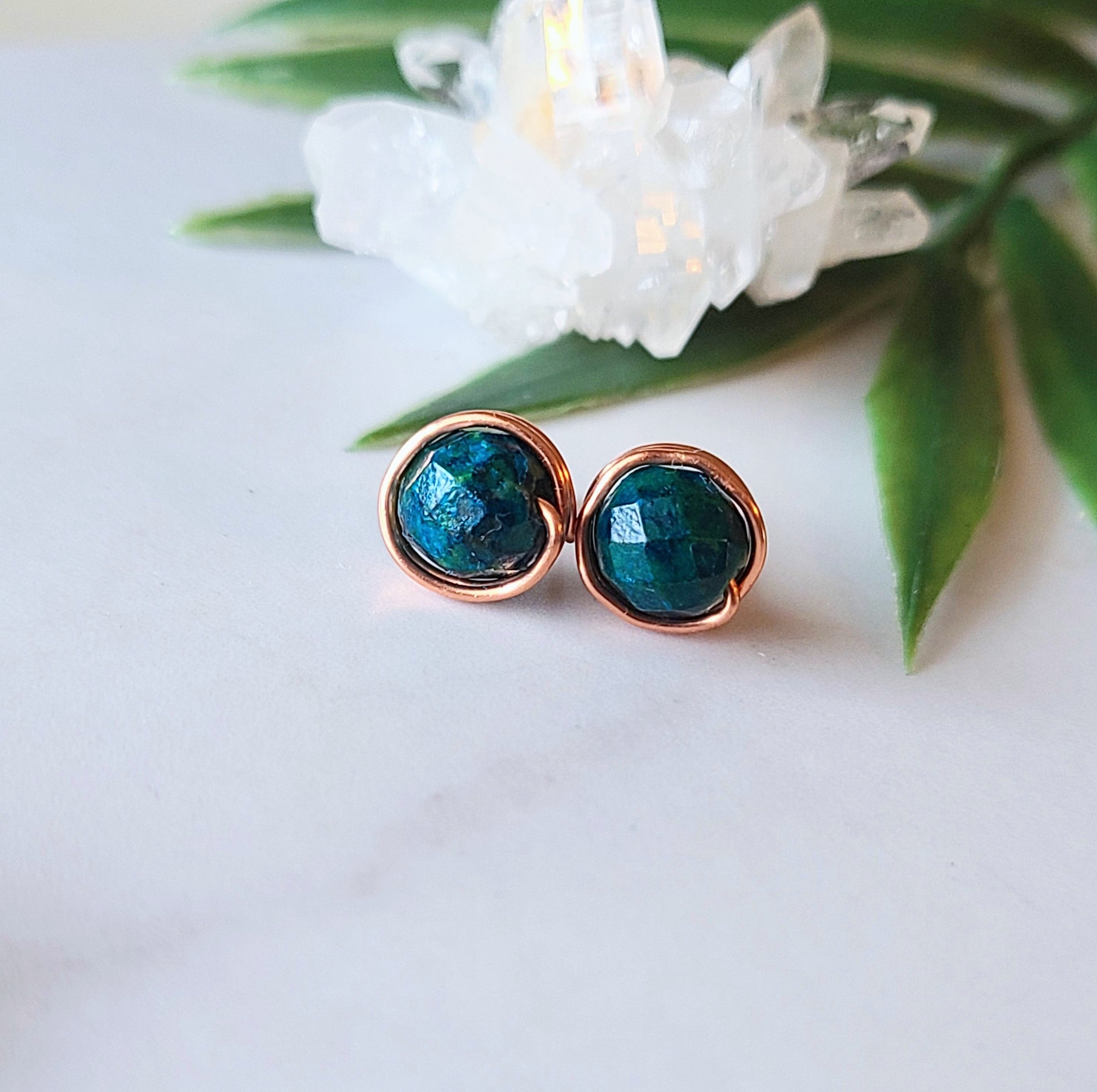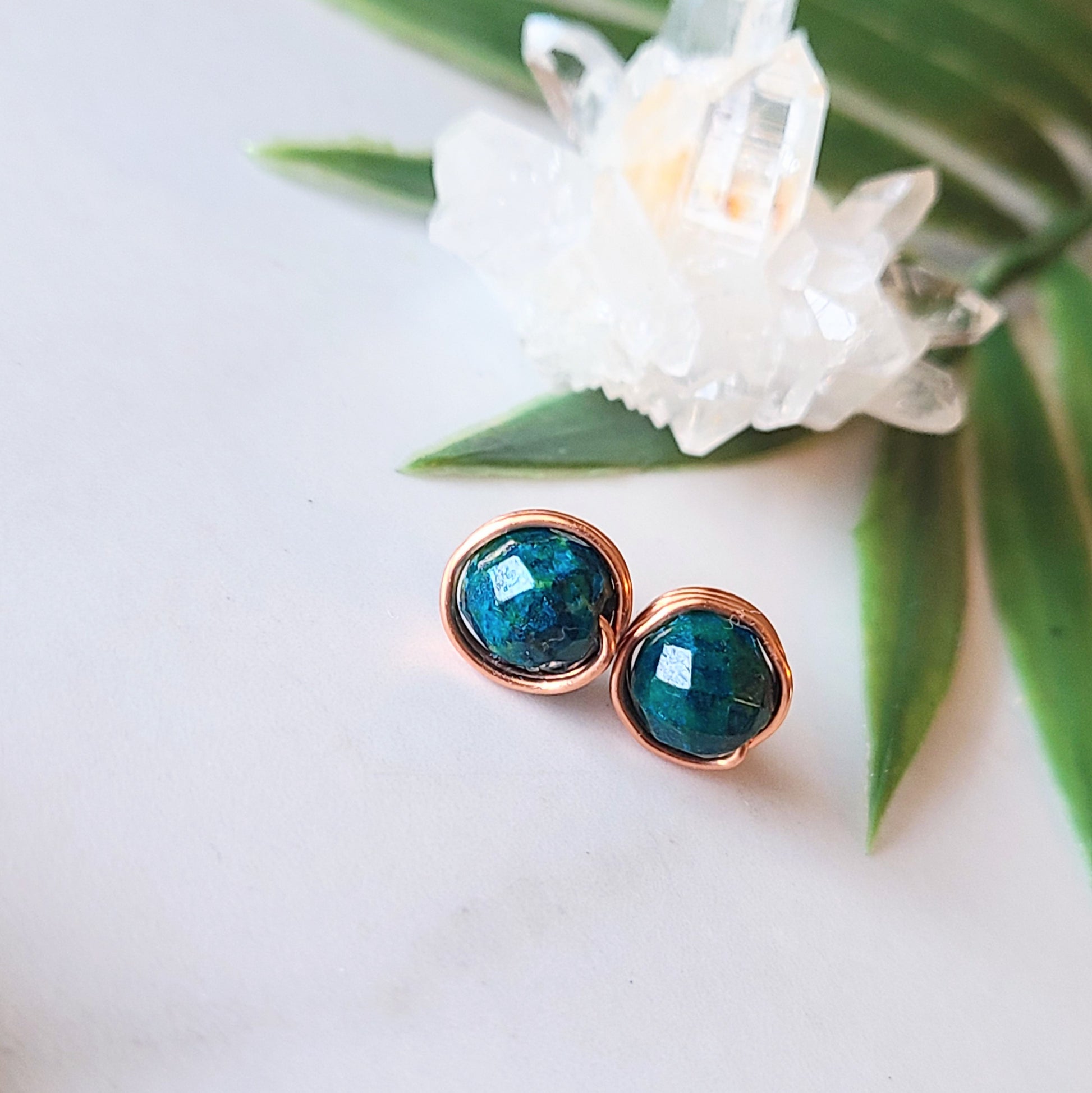 Natural gemstone sphere wrapped in raw copper to make the perfect studs for any and everyone.