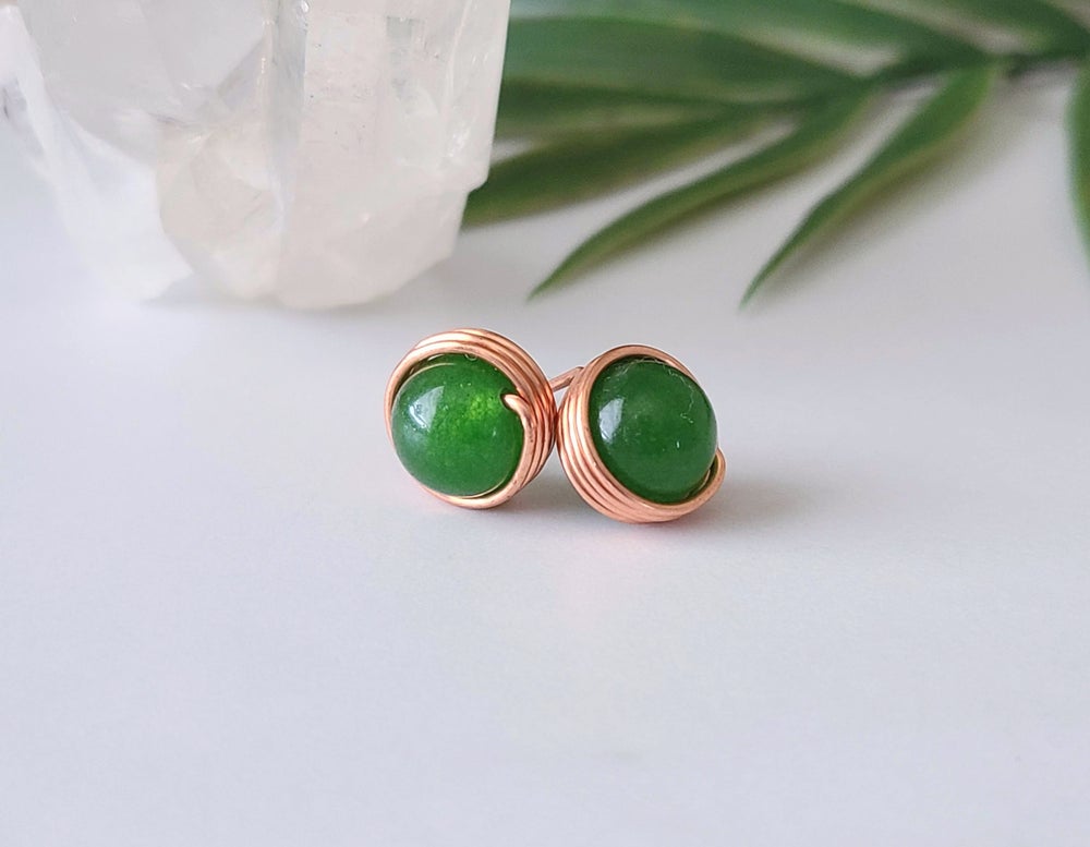 Natural gemstone sphere wrapped in raw copper to make the perfect studs for any and everyone. Pop in a pair to take some good vibes on your journey!
