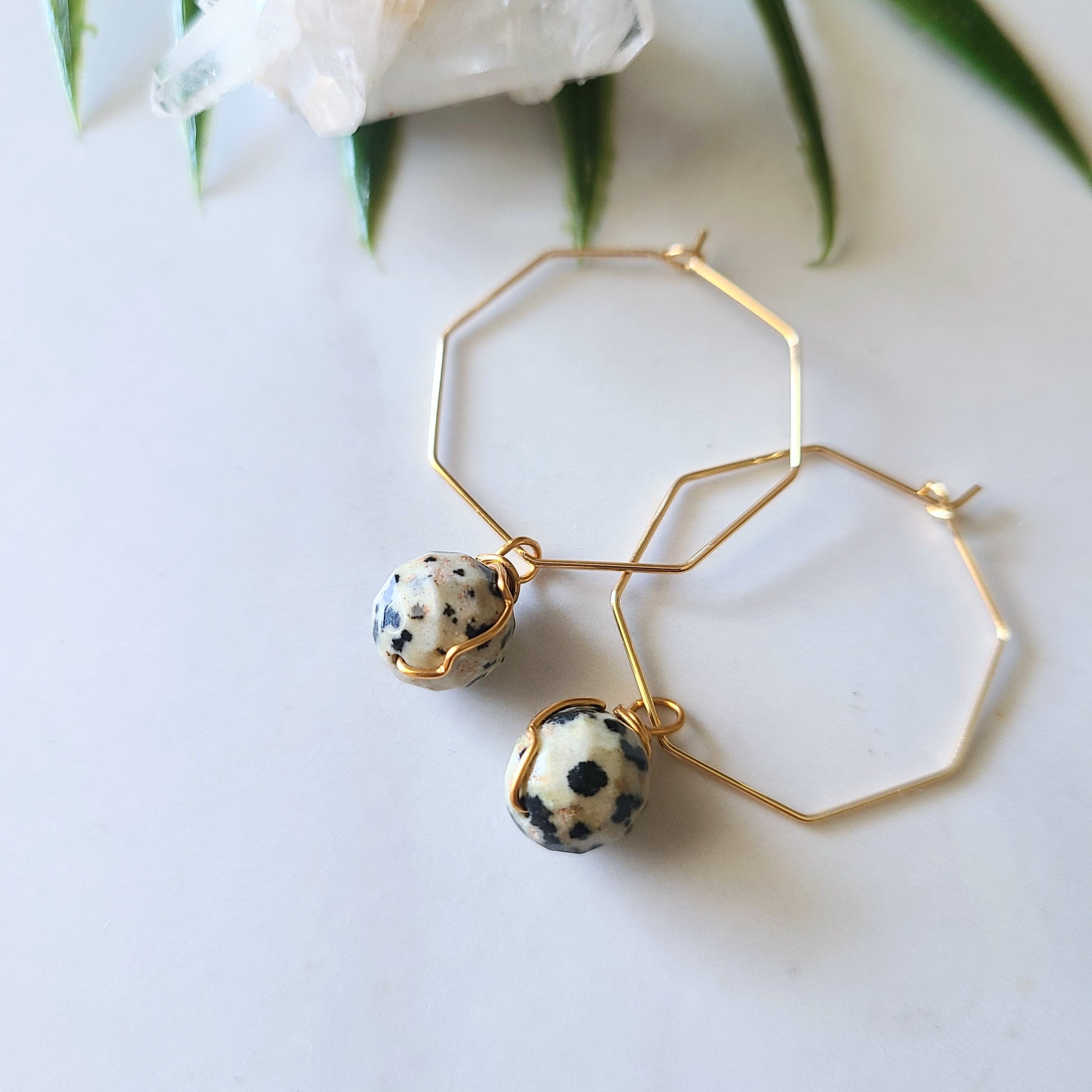 Single hand wrapped natural gemstone sphere swinging on an gold plated octagon hoop.