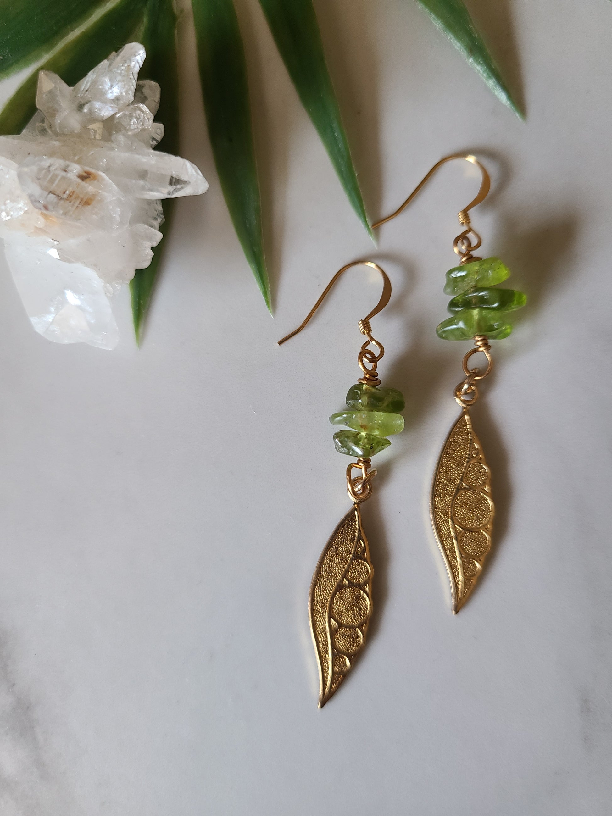 Brass pea pod charms with Peridot accents.