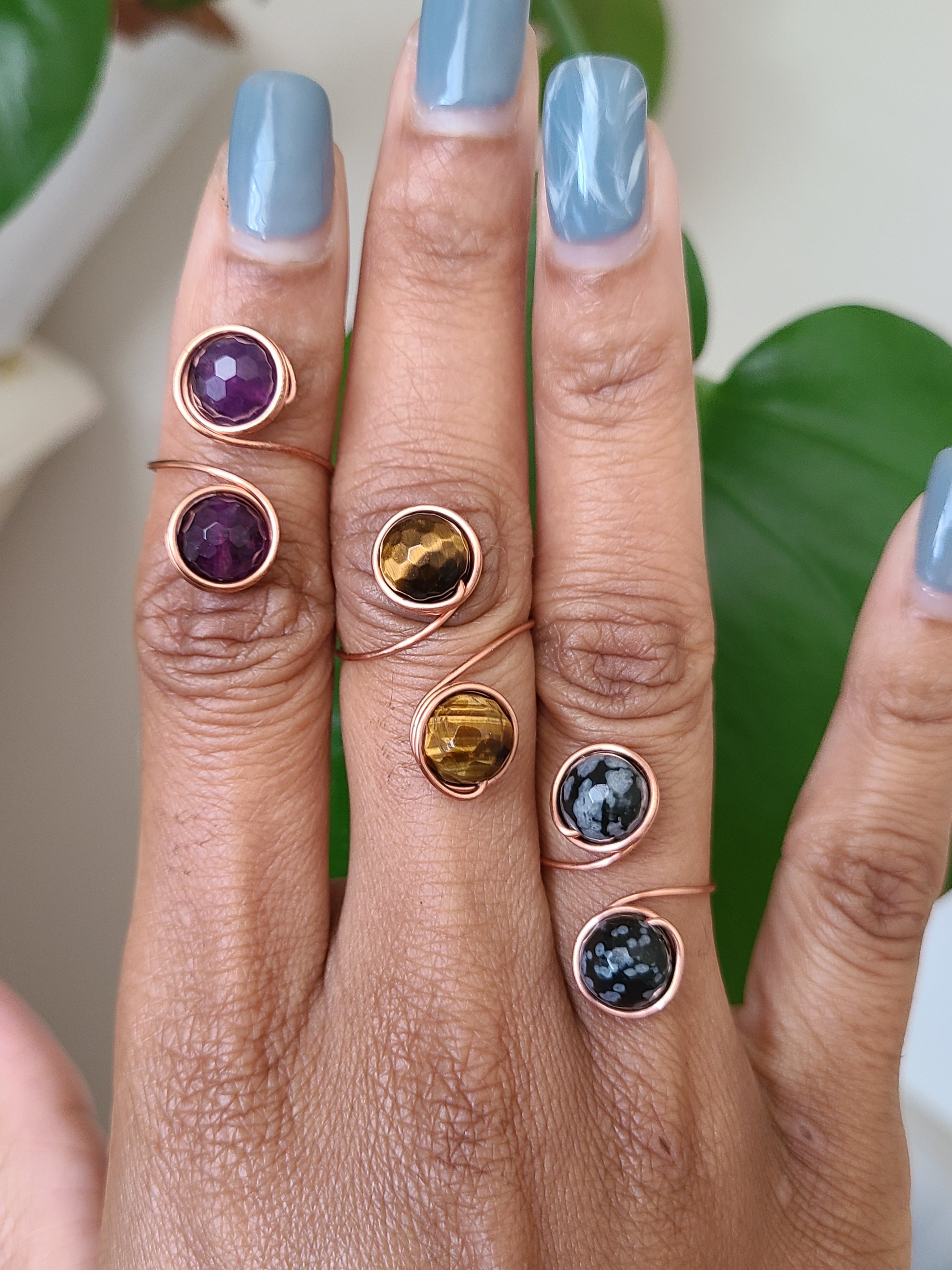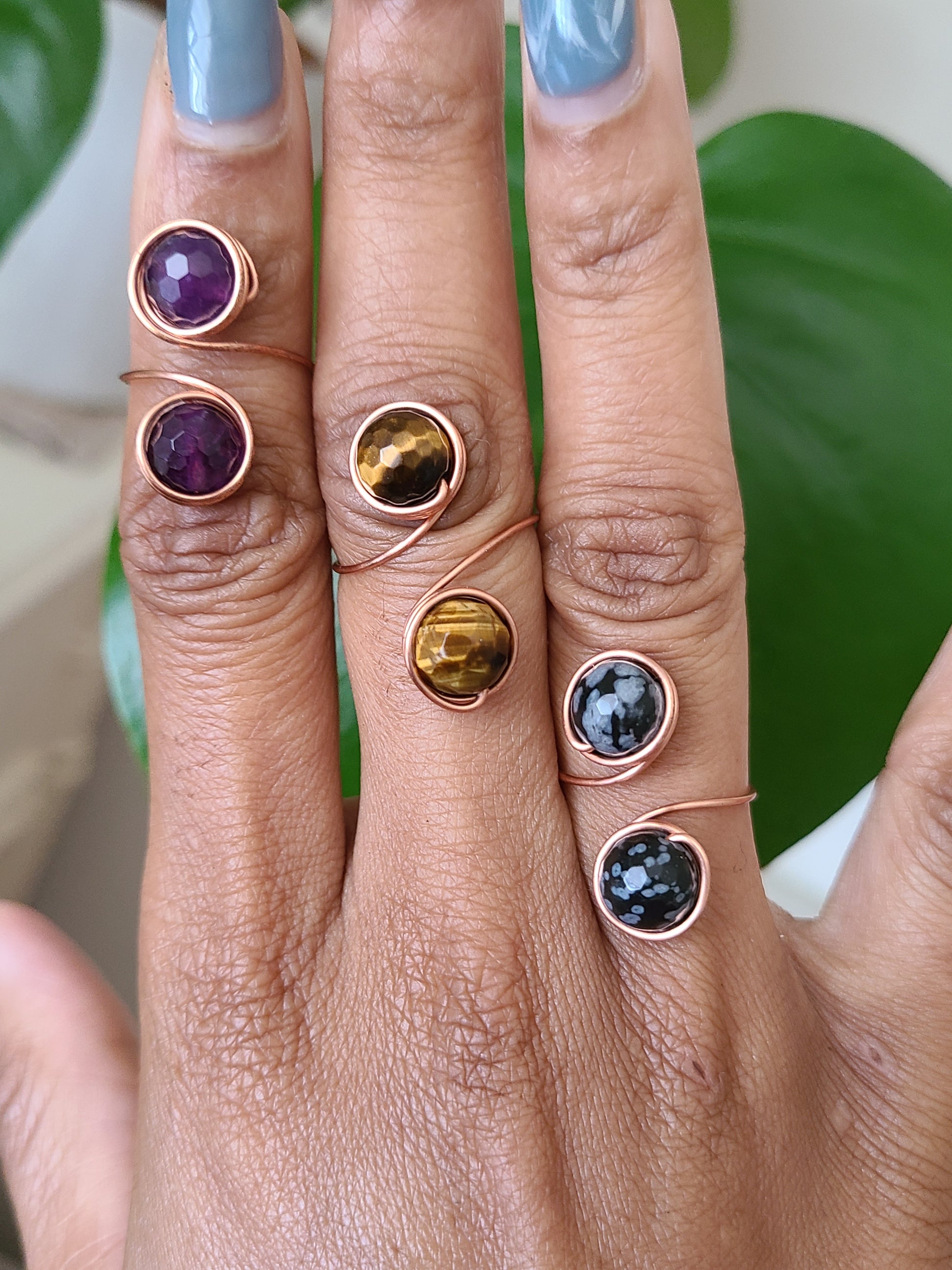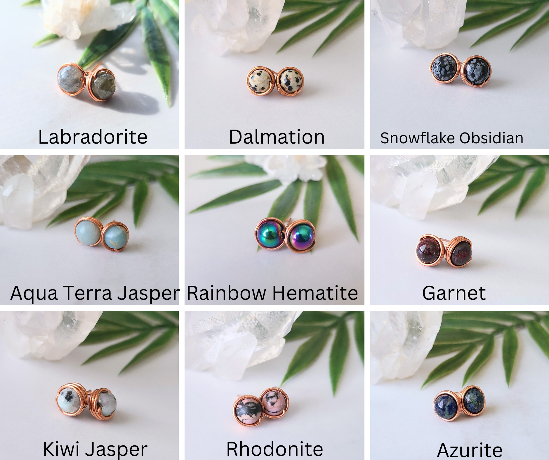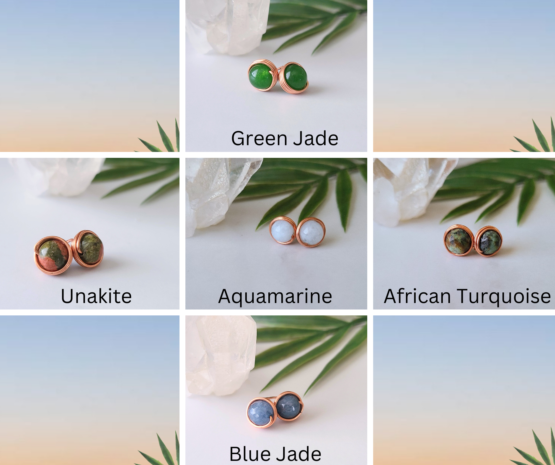 Two gemstone spheres hand-wrapped on solid copper wire.