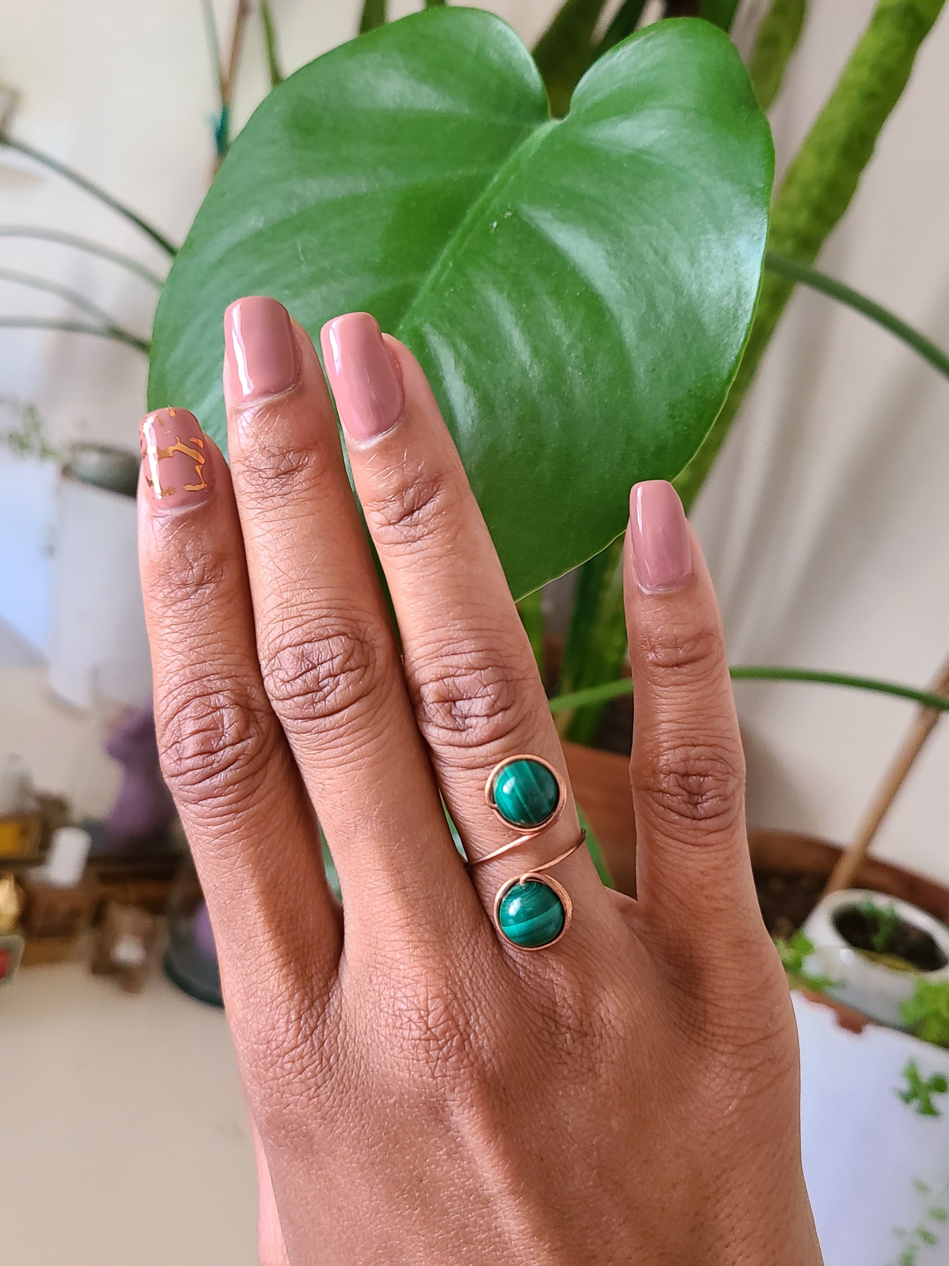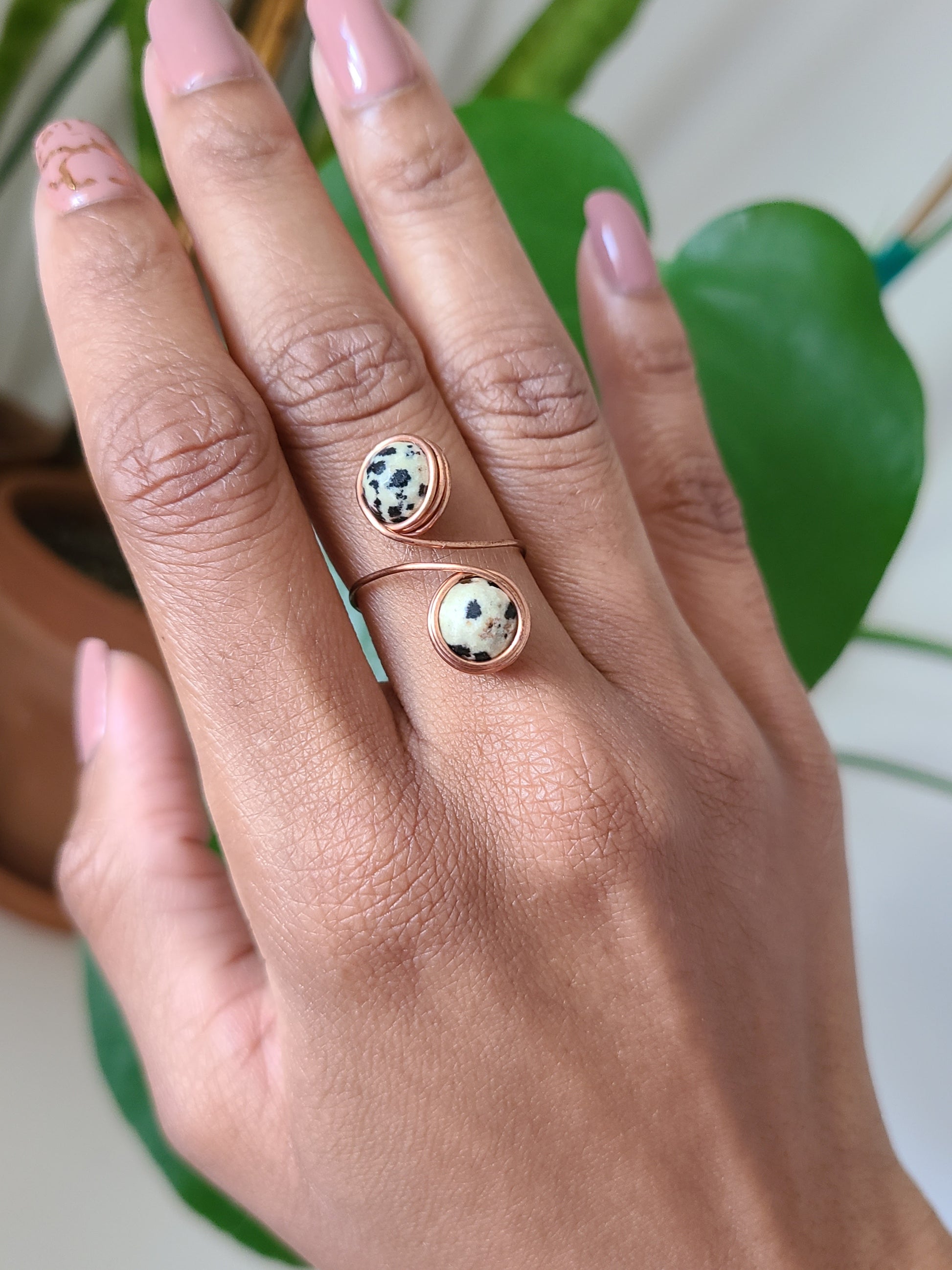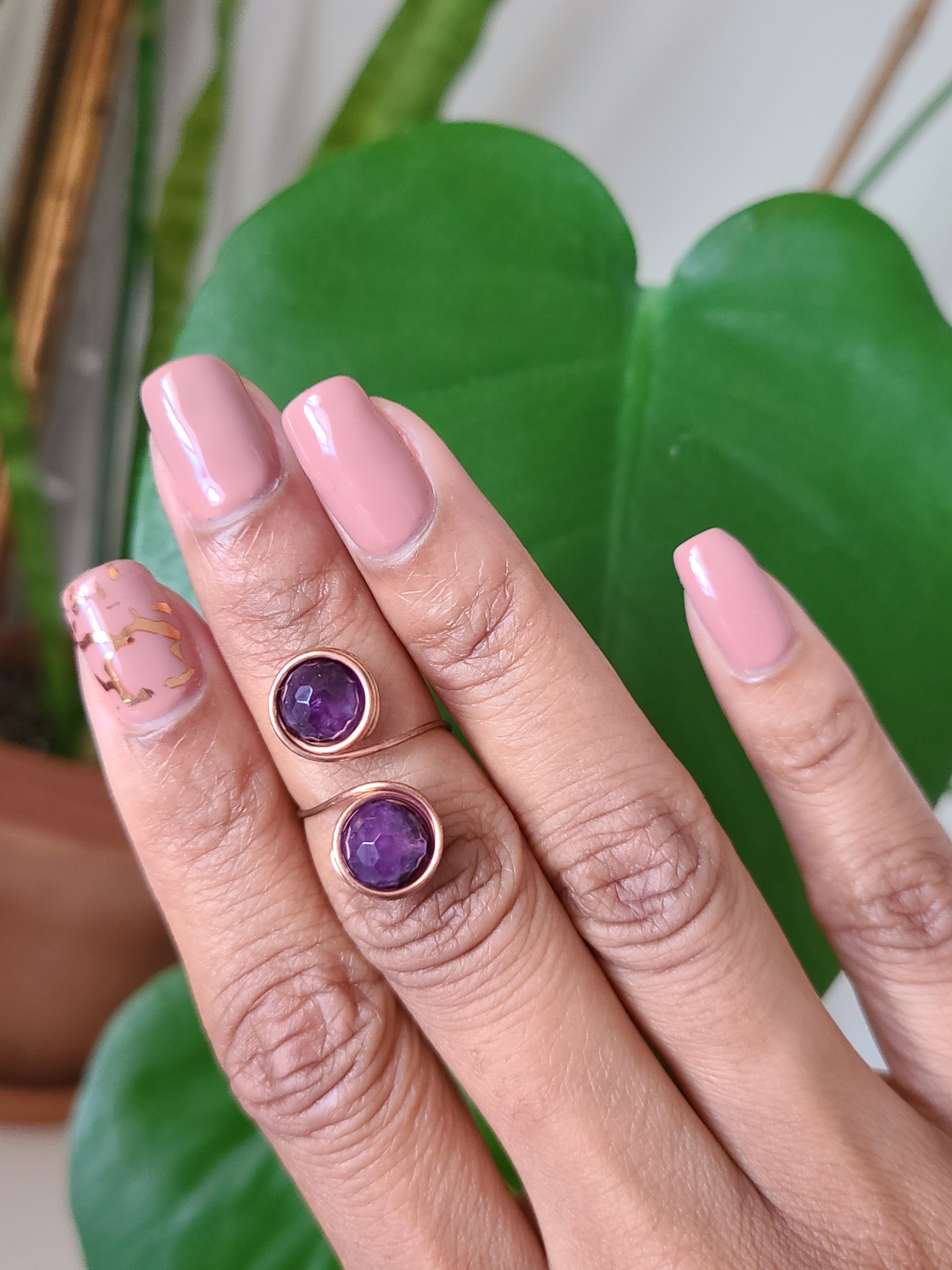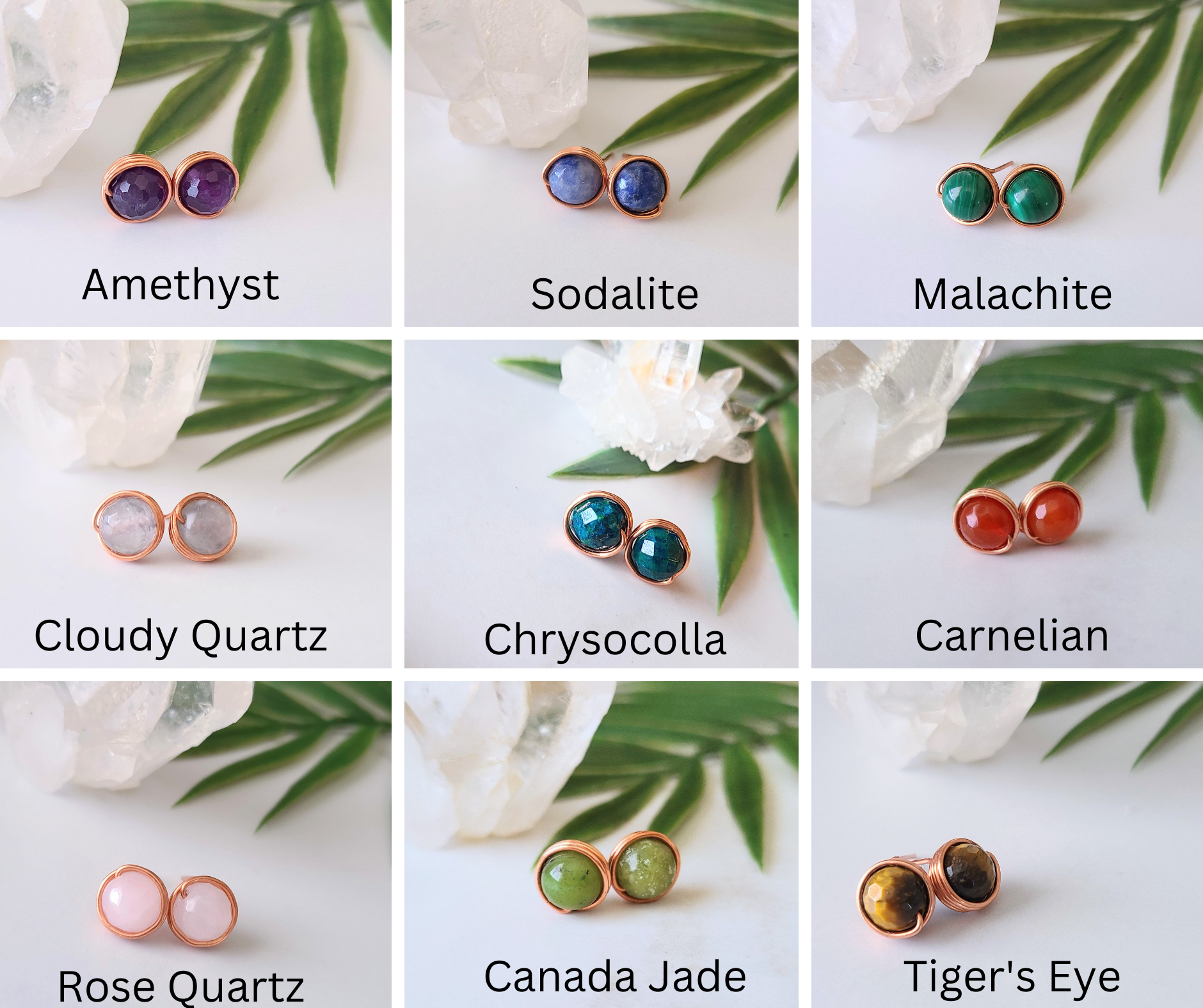 Two gemstone spheres hand-wrapped on solid copper wire.